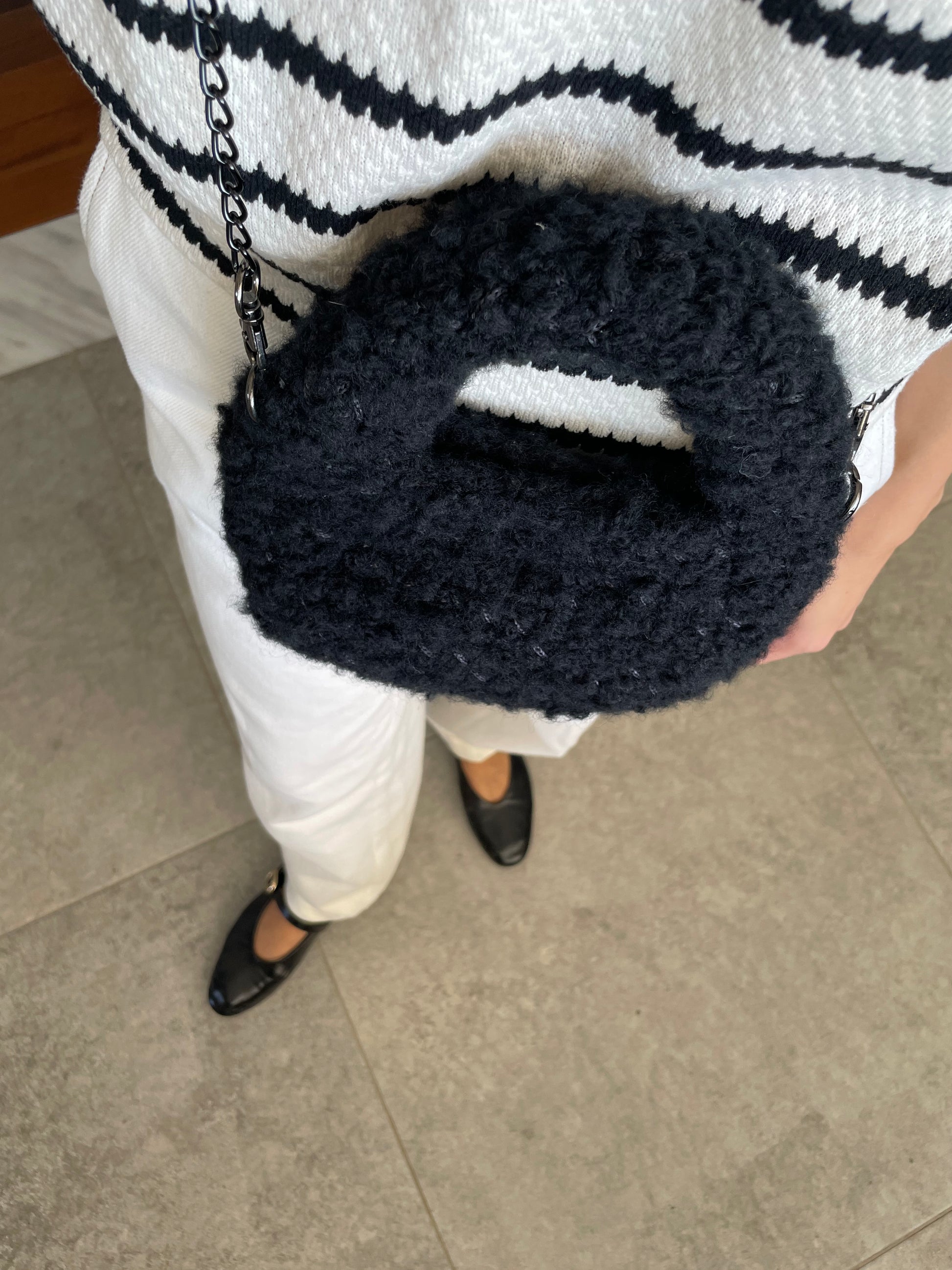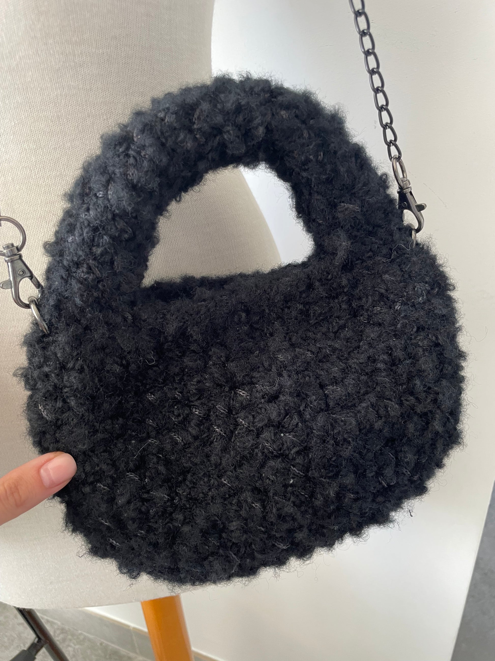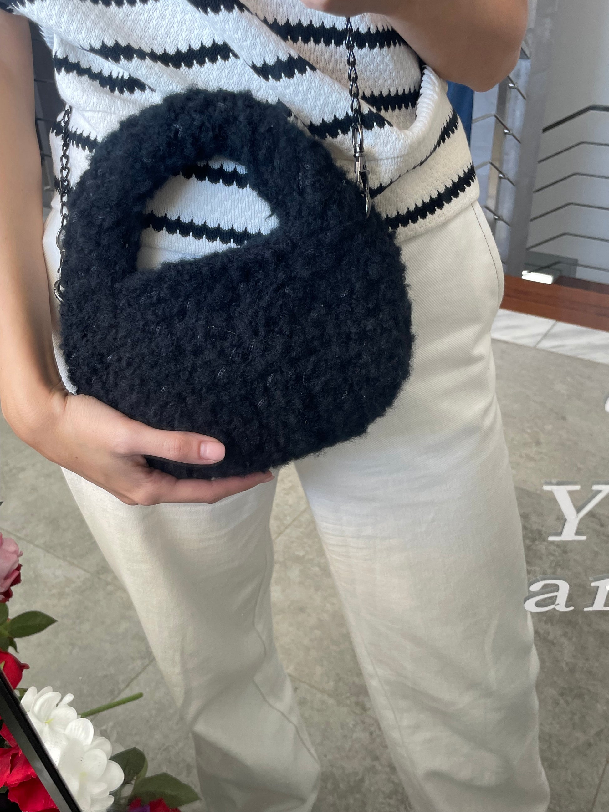 The Milly Bag is a charming, handcrafted accessory made from soft bouclé yarn and thin cord, ideal for your fall and winter outings. Its compact size and unique design add a cozy, stylish touch to any outfit while keeping your essentials close. Embrace warmth and elegance with this one-of-a-kind bag that complements the season perfectly.